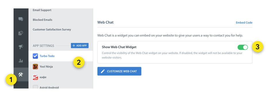 Make sure Show Web Chat Widget is enabled under Settings > App > Web Chat.